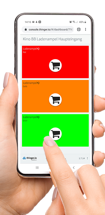 Fernbedienbar ist die Laden-Ampel und somit die Zutrittssteuerung für Ihren Laden mit jedem beliebigen Smartphone, Tablet oder einem PC. Rufen Sie dazu einfach das Ihnen per Mail versandte Ampel-Dashboard auf